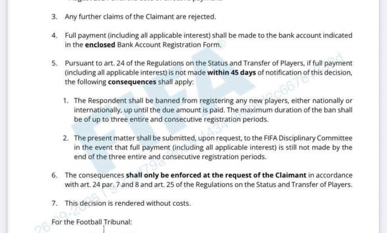 محكمة تسوية المنازعات التابعة للاتحاد الدولي لكرة القدم “فيفا” فرضت غرامة مالية على اللاعب بلغت “900” الف جنيه سوداني، يتم دفعها خلال 45 يوما بالإضافة إلى ضريبة تقدر بـ 5%.