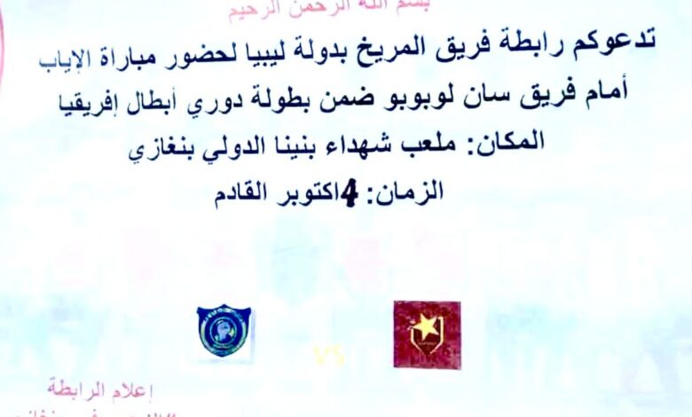 بدأت رابطة المريخ بليبيا عملية الحشد الجماهيري مبكرا، ذلك لمباراة المريخ امام سانت لوبوبو الكنغولي في اياب تمهيدي دوري ابطال افريقيا، في مساء السبت المقبل على ارضية ملعب شهداء بنينا ببنعازي.